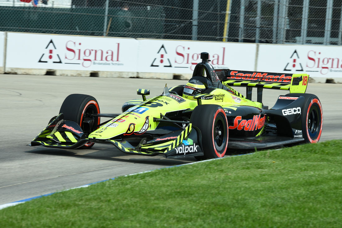 Sebastien Bourdais overcame an intense incident that saw him “wheelie” for several yards to finish ninth in the Detroit Grand Prix Race 2 on the 2.35-mile, 14-turn Belle Isle temporary street circuit. Bourdais began the day by qualifying ninth. He moved into seventh on the opening lap, but pitted on lap three in a strategy move to switch from the Firestone red alternate tires to the black primary tire. On lap 14, he was involved in an incident with Spencer Pigot, who tried to pit from the middle of the track as Bourdais was making a run on the inside.